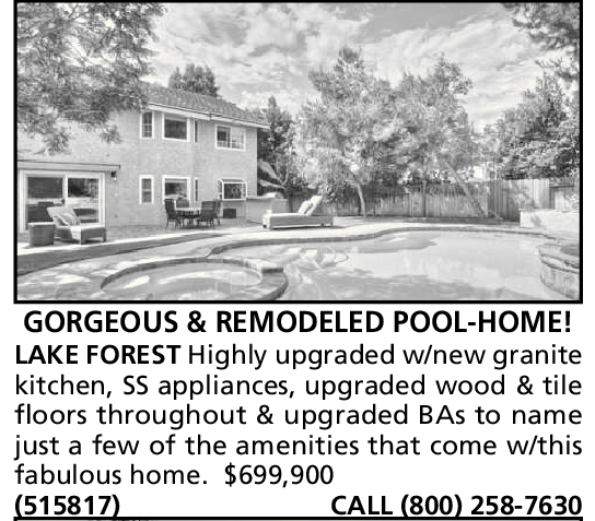 GORGEOUS & REMODELED POOL-HOME! LAKE FOREST Highly upgraded w/new granite kitchen, SS appliances, upgraded wood & tile floors throughout & upgraded BAs to name just a few of the amenities that come w/this fabulous home. $699,900 (515817) CALL (800) 258-7630