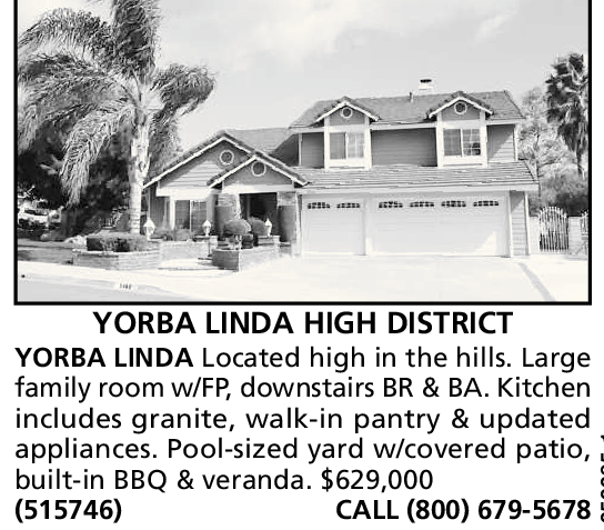 YORBA LINDA HIGH DISTRICT YORBA LINDA Located high in the hills. Large family room w/FP, downstairs BR & BA. Kitchen includes granite, walk-in pantry & updated appliances. Pool-sized yard w/covered patio, built-in BBQ & veranda. $629,000 (515746) CALL (800) 679-5678