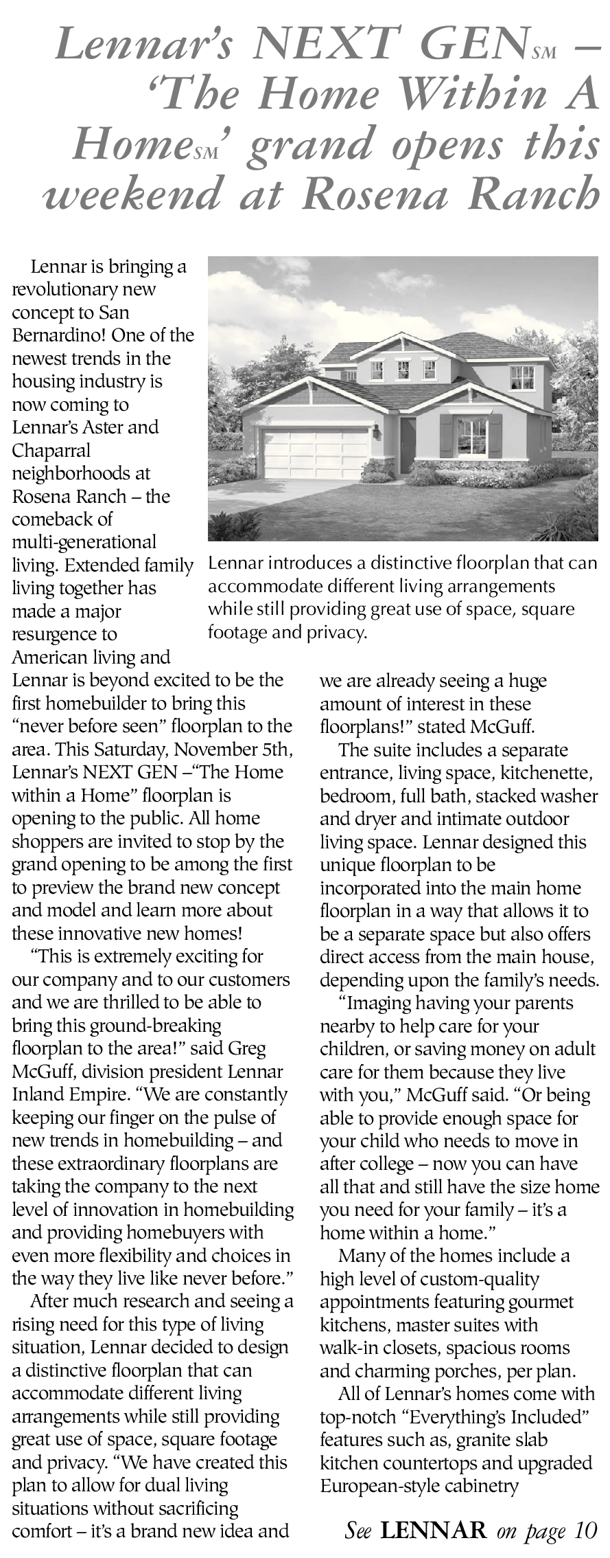 Lennar’s NEXT GENSM – ‘The Home Within A HomeSM’ grand opens this weekend at Rosena Ranch