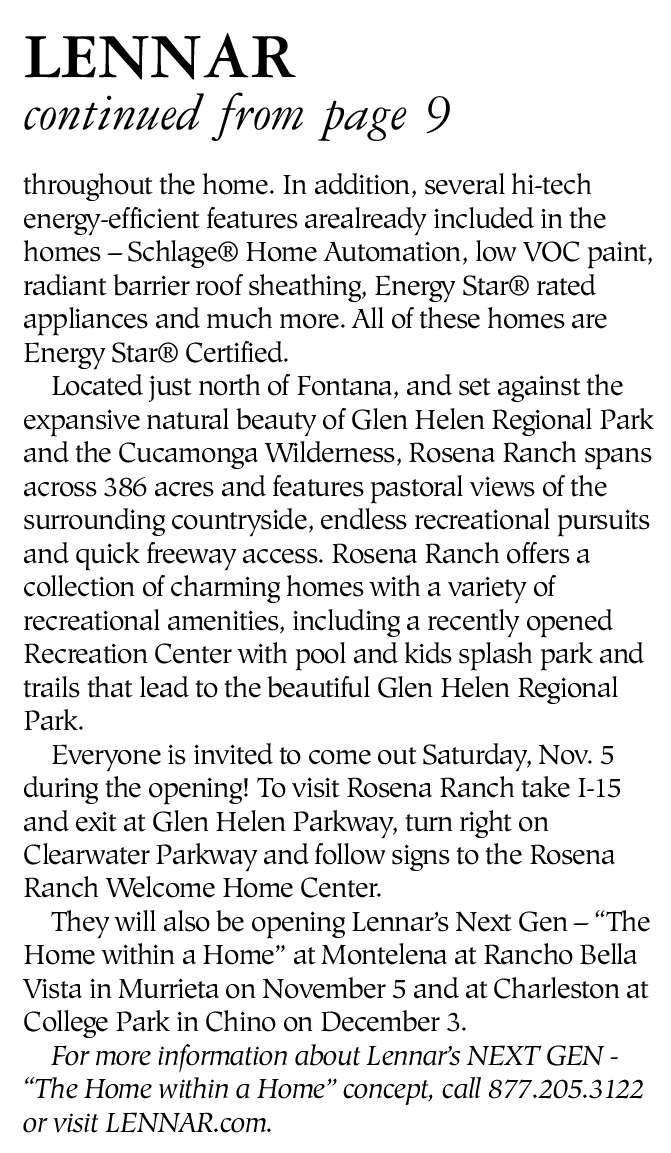 They will also be opening Lennar’s Next Gen – “The Home within a Home” at Montelena at Rancho Bella Vista in Murrieta on November 5 and at Charleston at College Park in Chino on December 3.