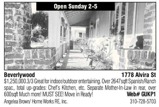 Open Sunday 2-5 Beverlywood 1778 Alvira St $1,250,000.3/3 Great for indoor/outdoor entertaining. Over 2647sqft Spanish/Ranch spac., total up-grades: Chef’s Kitchen, etc. Separate Mother-In-Law in rear, over 600sqft Much more! MUST SEE! Move in Ready! Web# GUKP1 Angelea Brown/ Home Works RE, Inc. 310-728-5703