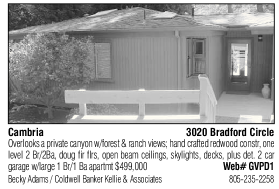 Cambria 3020 Bradford Circle Overlooks a private canyon w/forest & ranch views; hand crafted redwood constr, one level 2 Br/2Ba, doug ir lrs, open beam ceilings, skylights, decks, plus det. 2 car garage w/large 1 Br/1 Ba apartmt $499,000 Web# GVPD1