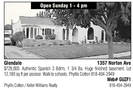 Glendale 1357 Norton Ave $729,000. Authentic Spanish 3 Bdrm, 1 3/4 Ba. Huge inished basement. Lot 12,180 sq ft per assesor. Walk to schools. Phyllis Cotton 818-404-2949 Web# GUZF1 Phyllis Cotton / Keller Williams Realty 818-404-2949