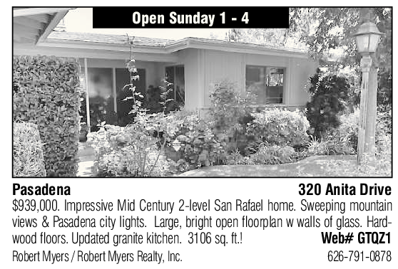 Pasadena 320 Anita Drive $939,000. Impressive Mid Century 2-level San Rafael home. Sweeping mountain views & Pasadena city lights. Large, bright open loorplan w walls of glass. Hardwood loors. Updated granite kitchen. 3106 sq. ft.! Web# GTQZ1 Robert Myers / Robert Myers Realty, Inc. 626-791-0878