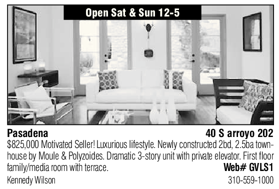 Open Sat & Sun 12-5 Kennedy Wilson 310-559-1000 Pasadena 40 S arroyo 202 $825,000 Motivated Seller! Luxurious lifestyle. Newly constructed 2bd, 2.5ba townhouse by Moule & Polyzoides. Dramatic 3-story unit with private elevator. First loor family/media room with terrace. Web# GVLS1