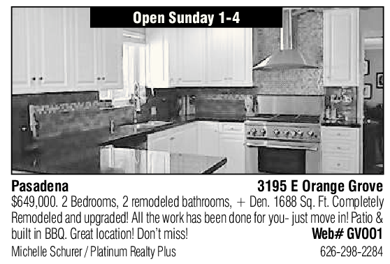 Pasadena 3195 E Orange Grove $649,000. 2 Bedrooms, 2 remodeled bathrooms, + Den. 1688 Sq. Ft. Completely Remodeled and upgraded! All the work has been done for you- just move in! Patio & built in BBQ. Great location! Don’t miss! Web# GVOO1