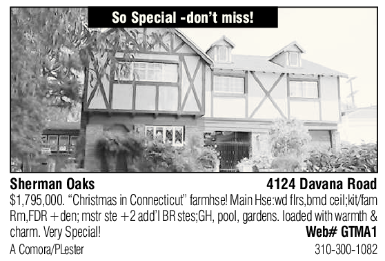 Sherman Oaks 4124 Davana Road $1,795,000. “Christmas in Connecticut” farmhse! Main Hse:wd lrs,bmd ceil;kit/fam Rm,FDR +den; mstr ste +2 add’l BR stes;GH, pool, gardens. loaded with warmth & charm. Very Special! Web# GTMA1