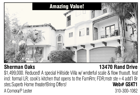 Amazing Value! A Comora/P Lester 310-300-1082 Sherman Oaks 13470 Rand Drive $1,499,000. Reduced! A special Hillside Villa w/ wnderful scale & low thuoutt. feat incl: formal LR; cook’s kitchen that opens to the FamRm; FDR;mstr ste+4 add’l Br stes;Superb Home theater!Bring Offers! Web# GSKT1