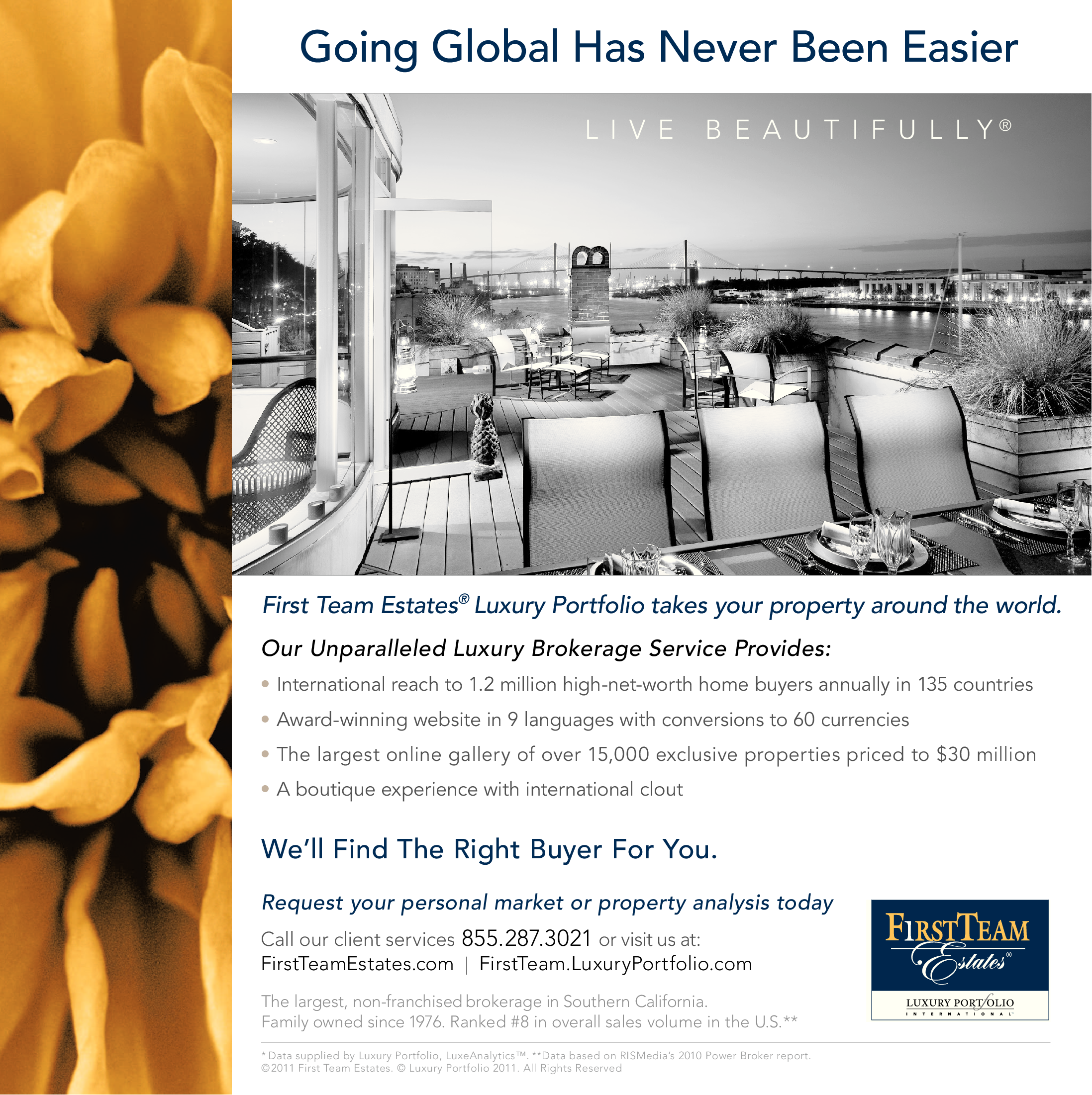 Going Global Has Never Been Easier L I V E B E A U T I F U L L Y ® First Team Estates ® Luxury Portfolio takes your property around the world. Our Unparalleled Luxury Brokerage Service Provides: • International reach to 1.2 million high-net-worth home buyers annually in 135 countries • Award-winning website in 9 languages with conversions to 60 currencies • The largest online gallery of over 15,000 exclusive properties priced to $30 million • A boutique experience with international clout We’ll Find The Right Buyer For You. Request your personal market or property analysis today Call our client services 855.287.3021 or visit us at: FirstTeamEstates.com | FirstTeam.LuxuryPortfolio.com The largest, non-franchised brokerage in Southern California. Family owned since 1976. Ranked #8 in overall sales volume in the U.S.** * Data supplied by Luxury Portfolio, LuxeAnalytics™. **Data based on RISMedia’s 2010 Power Broker report. ©2011 First Team Estates. © Luxury Portfolio 2011. All Rights Reserved
