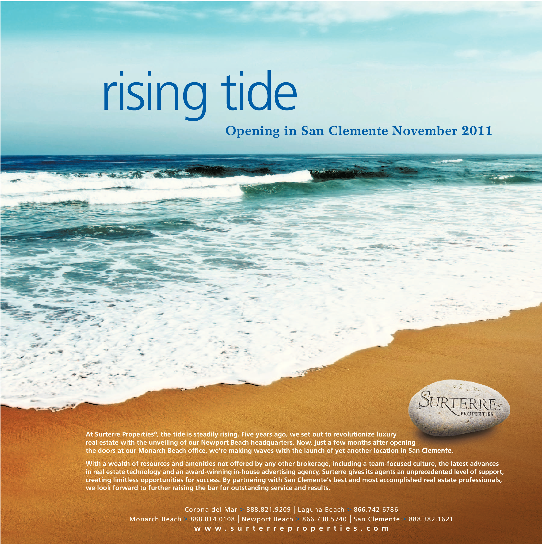 rising tide Opening in San Clemente November 2011 At Surterre Properties ® , the tide is steadily rising. Five years ago, we set out to revolutionize luxury real estate with the unveiling of our Newport Beach headquarters. Now, just a few months after opening the doors at our Monarch Beach office, we’re making waves with the launch of yet another location in San Clemente. With a wealth of resources and amenities not offered by any other brokerage, including a team-focused culture, the latest advances in real estate technology and an award-winning in-house advertising agency, Surterre gives its agents an unprecedented level of support, creating limitless opportunities for success. By partnering with San Clemente’s best and most accomplished real estate professionals, we look forward to further raising the bar for outstanding service and results. Corona del Mar > 888.821.9209 Laguna Beach > 866.742.6786 Monarch Beach > 888.814.0108 Newport Beach > 866.738.5740 San Clemente > 888.382.1621 w w w . s u r t e r r e p r o p e r t i e s . c o m