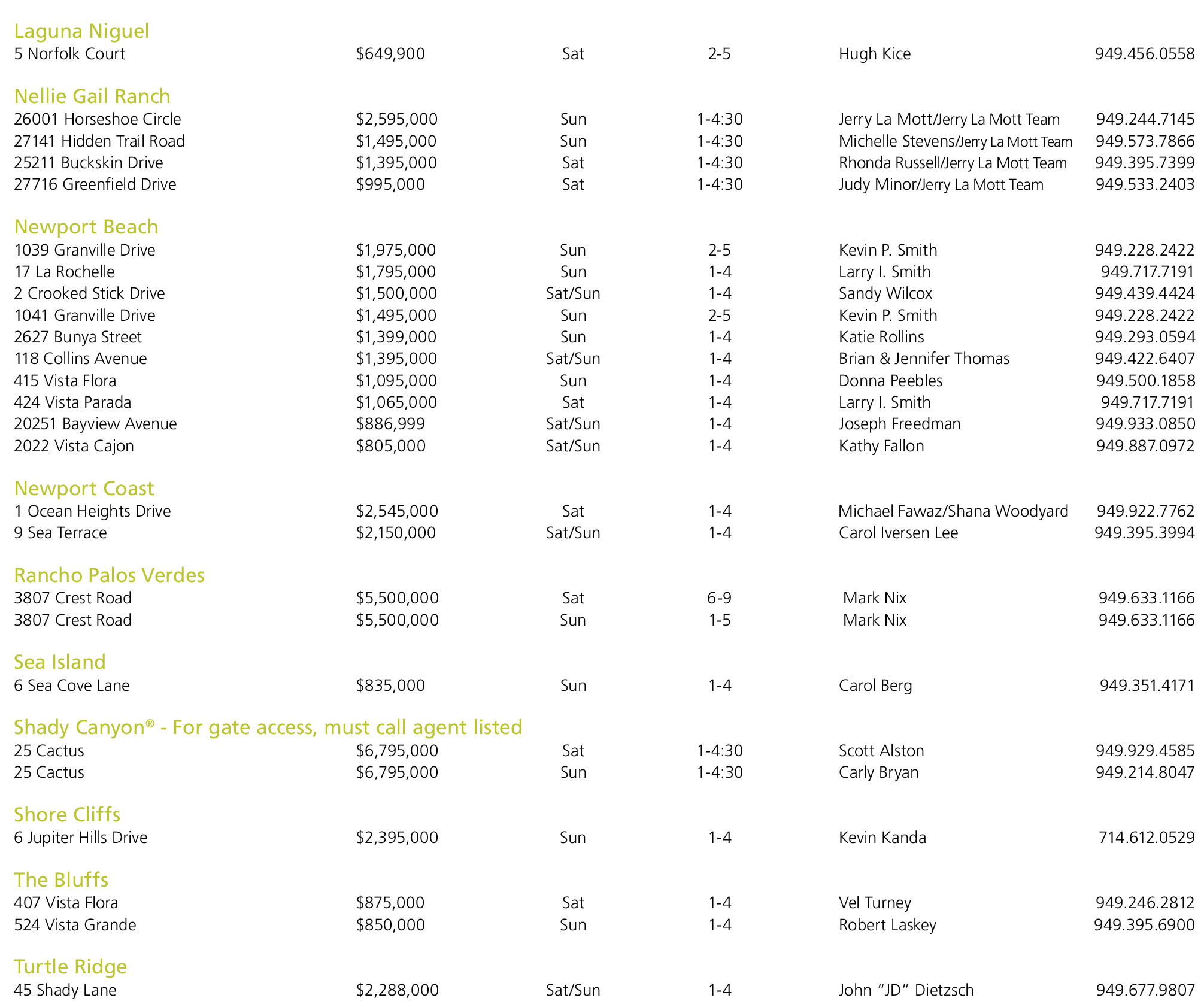 Newport Beach 1039 Granville Drive $1,975,000 Sun 2-5 Kevin P. Smith 949.228.2422 17 La Rochelle $1,795,000 Sun 1-4 Larry I. Smith 949.717.7191 2 Crooked Stick Drive $1,500,000 Sat/Sun 1-4 Sandy Wilcox 949.439.4424 1041 Granville Drive $1,495,000 Sun 2-5 Kevin P. Smith 949.228.2422 2627 Bunya Street $1,399,000 Sun 1-4 Katie Rollins 949.293.0594 118 Collins Avenue $1,395,000 Sat/Sun 1-4 Brian & Jennifer Thomas 949.422.6407 415 Vista Flora $1,095,000 Sun 1-4 Donna Peebles 949.500.1858 424 Vista Parada $1,065,000 Sat 1-4 Larry I. Smith 949.717.7191 20251 Bayview Avenue $886,999 Sat/Sun 1-4 Joseph Freedman 949.933.0850 2022 Vista Cajon $805,000 Sat/Sun 1-4 Kathy Fallon 949.887.0972 Newport Coast 1 Ocean Heights Drive $2,545,000 Sat 1-4 Michael Fawaz/Shana Woodyard 949.922.7762 9 Sea Terrace $2,150,000 Sat/Sun 1-4 Carol Iversen Lee 949.395.3994 Rancho Palos Verdes 3807 Crest Road $5,500,000 Sat 6-9 Mark Nix 949.633.1166 3807 Crest Road $5,500,000 Sun 1-5 Mark Nix 949.633.1166 Sea Island 6 Sea Cove Lane $835,000 Sun 1-4 Carol Berg 949.351.4171 Shady Canyon ® - For gate access, must call agent listed 25 Cactus $6,795,000 Sat 1-4:30 Scott Alston 949.929.4585 25 Cactus $6,795,000 Sun 1-4:30 Carly Bryan 949.214.8047 Shore Cliffs 6 Jupiter Hills Drive $2,395,000 Sun 1-4 Kevin Kanda 714.612.0529 The Bluffs 407 Vista Flora $875,000 Sat 1-4 Vel Turney 949.246.2812 524 Vista Grande $850,000 Sun 1-4 Robert Laskey 949.395.6900 Turtle Ridge 45 Shady Lane $2,288,000 Sat/Sun 1-4 John “JD” Dietzsch 949.677.9807