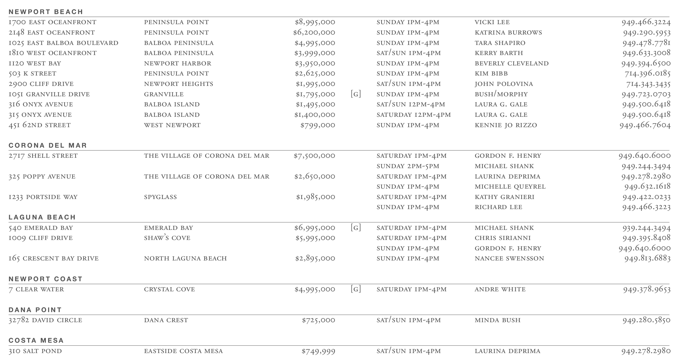 NEWPORT BEACH 1700 east oceanfront peninsula point $8,995,000 sunday 1pm-4pm vicki lee 949.466.3224 2148 east oceanfront peninsula point $6,200,000 sunday 1pm-4pm katrina burrows 949.290.5953 1025 east balboa boulevard balboa peninsula $4,995,000 sunday 1pm-4pm tara shapiro 949.478.7781 1810 west oceanfront balboa peninsula $3,999,000 sat/sun 1pm-4pm kerry barth 949.633.3008 1120 west bay newport harbor $3,950,000 sunday 1pm-4pm beverly cleveland 949.394.6500 503 k street peninsula point $2,625,000 sunday 1pm-4pm kim bibb 714.396.0185 2900 cliff drive newport heights $1,995,000 sat/sun 1pm-4pm john polovina 714.343.3435 1051 granville drive granville $1,795,000 [g] sunday 1pm-4pm bush/morphy 949.723.0703 316 onyx avenue balboa island $1,495,000 sat/sun 12pm-4pm laura g. gale 949.500.6418 315 onyx avenue balboa island $1,400,000 saturday 12pm-4pm laura g. gale 949.500.6418 451 62nd street west newport $799,000 sunday 1pm-4pm kennie jo rizzo 949.466.7604