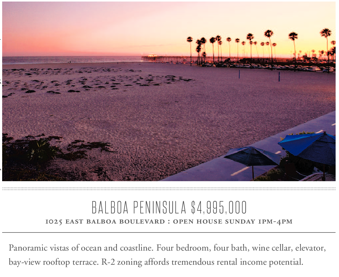 14 BALBOA PENINSULA $4,995,000 1025 east balboa boulevard : open house sunday 1pm-4pm Panoramic vistas of ocean and coastline. Four bedroom, four bath, wine cellar, elevator, bay-view rooftop terrace. R-2 zoning affords tremendous rental income potential.