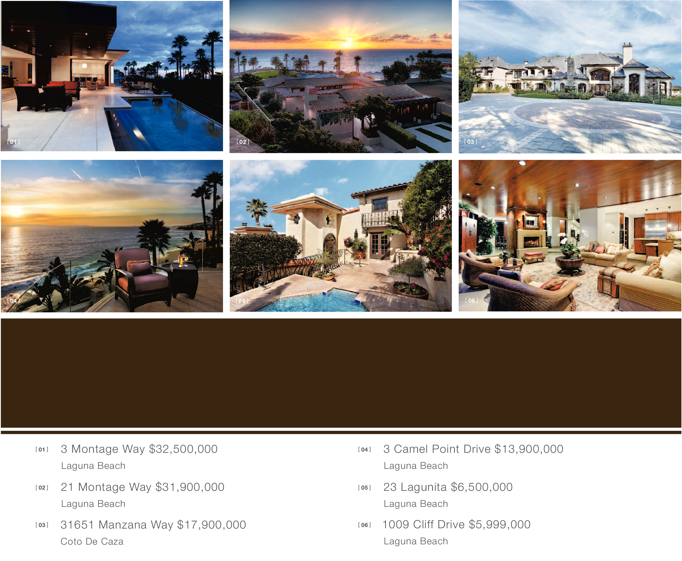 [ 01] [ 02] [ 03] [ 04] [ 05] [ 06] [ 01] [ 02] [ 03] 3 Montage Way $32,500,000 Laguna Beach 21 Montage Way $31,900,000 Laguna Beach 31651 Manzana Way $17,900,000 Coto De Caza [ 04] [ 05] [ 06] 3 Camel Point Drive $13,900,000 Laguna Beach 23 Lagunita $6,500,000 Laguna Beach 1009 Cliff Drive $5,999,000 Laguna Beach