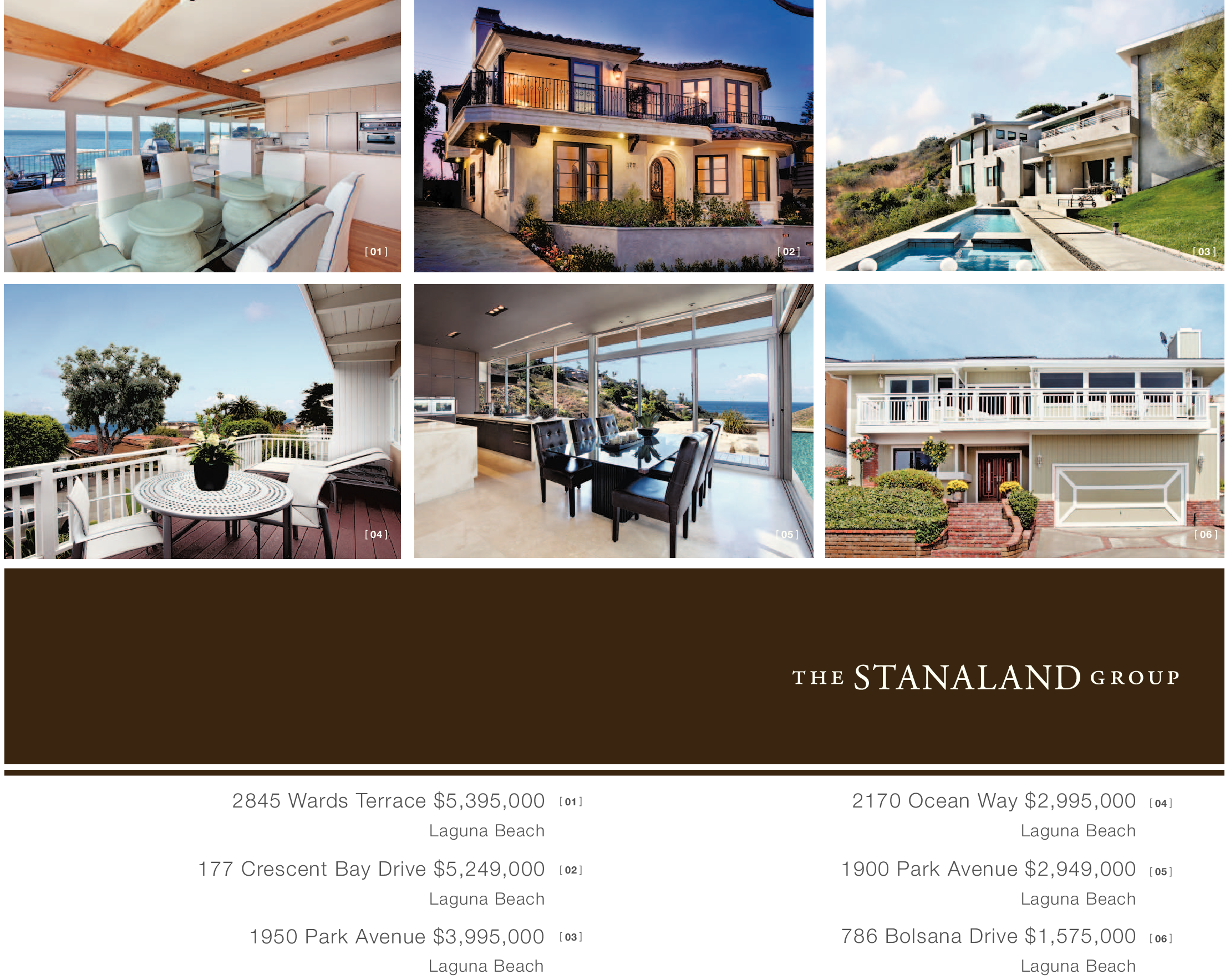 [ 01] [ 02] [ 03] [ 04] [ 05] [ 06] 2845 Wards Terrace $5,395,000 Laguna Beach 177 Crescent Bay Drive $5,249,000 Laguna Beach 1950 Park Avenue $3,995,000 Laguna Beach [ 01] [ 02] [ 03] 2170 Ocean Way $2,995,000 Laguna Beach 1900 Park Avenue $2,949,000 Laguna Beach 786 Bolsana Drive $1,575,000 Laguna Beach [ 04] [ 05] [ 06]