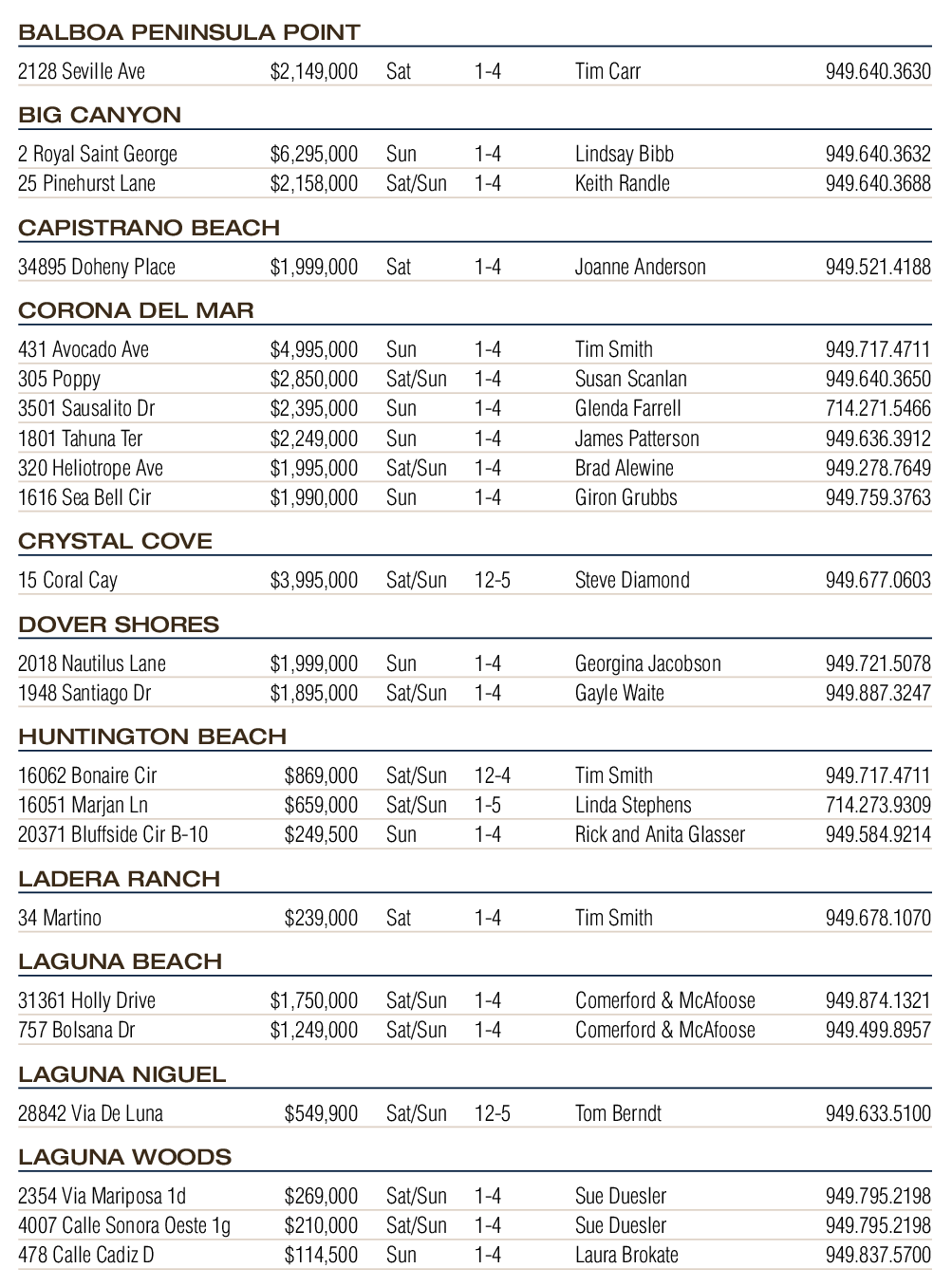 431 Avocado Ave $4,995,000 Sun 1-4 Tim Smith 949.717.4711 305 Poppy $2,850,000 Sat/Sun 1-4 Susan Scanlan 949.640.3650 3501 Sausalito Dr $2,395,000 Sun 1-4 Glenda Farrell 714.271.5466 1801 Tahuna Ter $2,249,000 Sun 1-4 James Patterson 949.636.3912 320 Heliotrope Ave $1,995,000 Sat/Sun 1-4 Brad Alewine 949.278.7649 1616 Sea Bell Cir $1,990,000 Sun 1-4 Giron Grubbs 949.759.3763