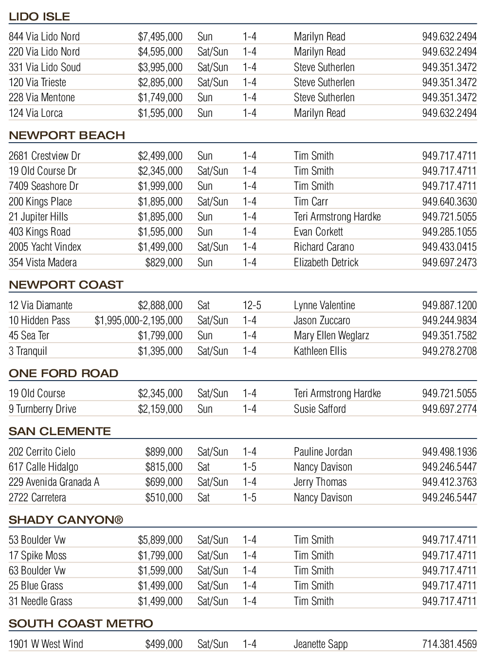 2681 Crestview Dr $2,499,000 Sun 1-4 Tim Smith 949.717.4711 19 Old Course Dr $2,345,000 Sat/Sun 1-4 Tim Smith 949.717.4711 7409 Seashore Dr $1,999,000 Sun 1-4 Tim Smith 949.717.4711 200 Kings Place $1,895,000 Sat/Sun 1-4 Tim Carr 949.640.3630 21 Jupiter Hills $1,895,000 Sun 1-4 Teri Armstrong Hardke 949.721.5055 403 Kings Road $1,595,000 Sun 1-4 Evan Corkett 949.285.1055 2005 Yacht Vindex $1,499,000 Sat/Sun 1-4 Richard Carano 949.433.0415 354 Vista Madera $829,000 Sun 1-4 Elizabeth Detrick 949.697.2473