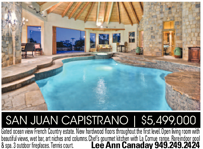 SAN JUAN CAPISTRANO | $5,499,000 Gated ocean view French Country estate. New hardwood floors throughout the first level. Open living room with beautifulviews,wetbar,artnichesandcolumns.Chef`sgourmetkitchenwithLaCornuerange.Rareindoorpool & spa. 3 outdoor fireplaces. Tennis court. Lee Ann Canaday 949.249.2424