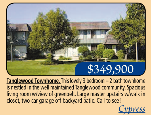 $349,900 Tanglewood Townhome. This lovely 3 bedroom – 2 bath townhome is nestled in the well maintained Tanglewood community. Spacious living room w/view of greenbelt. Large master upstairs w/walk in closet, two car garage off backyard patio. Call to see! Cypress