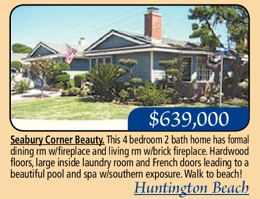 $639,000 Seabury Corner Beauty. This 4 bedroom 2 bath home has formal dining rm w/fireplace and living rm w/brick fireplace. Hardwood floors, large inside laundry room and French doors leading to a beautiful pool and spa w/southern exposure. Walk to beach! Huntington Beach