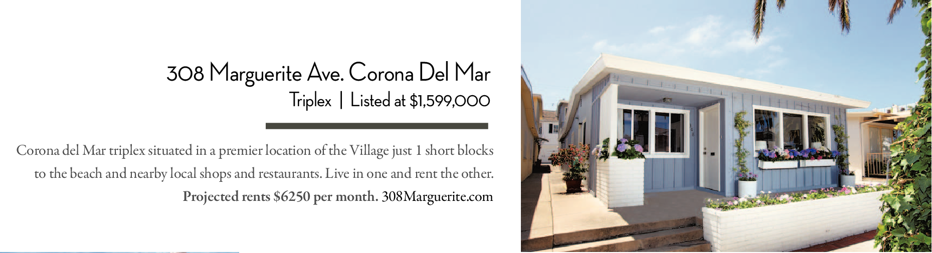 308 Marguerite Ave. Corona Del Mar Triplex | Listed at $1,599,000 Corona del Mar triplex situated in a premier location of the Village just 1 short blocks to the beach and nearby local shops and restaurants. Live in one and rent the other. Projected rents $6250 per month. 308Marguerite.com