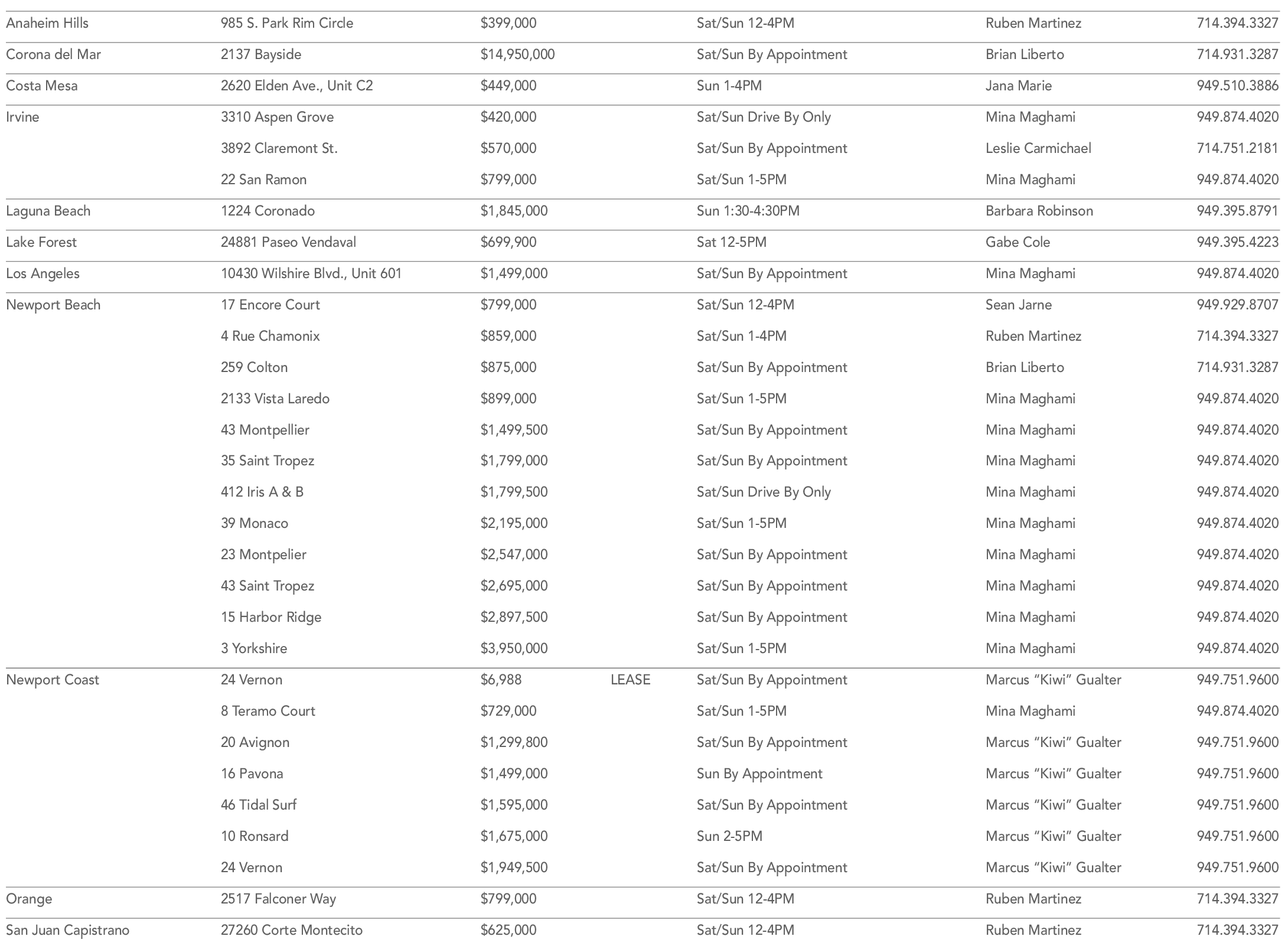 Laguna Beach 1224 Coronado $1,845,000 Sun 1:30-4:30PM Barbara Robinson 949.395.8791 Lake Forest 24881 Paseo Vendaval $699,900 Sat 12-5PM Gabe Cole 949.395.4223 Los Angeles 10430 Wilshire Blvd., Unit 601 $1,499,000 Sat/Sun By Appointment Mina Maghami 949.874.4020 Newport Beach 17 Encore Court $799,000 Sat/Sun 12-4PM Sean Jarne 949.929.8707 4 Rue Chamonix $859,000 Sat/Sun 1-4PM Ruben Martinez 714.394.3327 259 Colton $875,000 Sat/Sun By Appointment Brian Liberto 714.931.3287 2133 Vista Laredo $899,000 Sat/Sun 1-5PM Mina Maghami 949.874.4020 43 Montpellier $1,499,500 Sat/Sun By Appointment Mina Maghami 949.874.4020 35 Saint Tropez $1,799,000 Sat/Sun By Appointment Mina Maghami 949.874.4020 412 Iris A & B $1,799,500 Sat/Sun Drive By Only Mina Maghami 949.874.4020 39 Monaco $2,195,000 Sat/Sun 1-5PM Mina Maghami 949.874.4020 23 Montpelier $2,547,000 Sat/Sun By Appointment Mina Maghami 949.874.4020 43 Saint Tropez $2,695,000 Sat/Sun By Appointment Mina Maghami 949.874.4020 15 Harbor Ridge $2,897,500 Sat/Sun By Appointment Mina Maghami 949.874.4020 3 Yorkshire $3,950,000 Sat/Sun 1-5PM Mina Maghami 949.874.4020 Newport Coast 24 Vernon $6,988 LEASE Sat/Sun By Appointment Marcus “Kiwi” Gualter 949.751.9600 8 Teramo Court $729,000 Sat/Sun 1-5PM Mina Maghami 949.874.4020 20 Avignon $1,299,800 Sat/Sun By Appointment Marcus “Kiwi” Gualter 949.751.9600 16 Pavona $1,499,000 Sun By Appointment Marcus “Kiwi” Gualter 949.751.9600 46 Tidal Surf $1,595,000 Sat/Sun By Appointment Marcus “Kiwi” Gualter 949.751.9600 10 Ronsard $1,675,000 Sun 2-5PM Marcus “Kiwi” Gualter 949.751.9600 24 Vernon $1,949,500 Sat/Sun By Appointment Marcus “Kiwi” Gualter 949.751.9600 Orange 2517 Falconer Way $799,000 Sat/Sun 12-4PM Ruben Martinez 714.394.3327 San Juan Capistrano 27260 Corte Montecito $625,000 Sat/Sun 12-4PM Ruben Martinez 714.394.3327