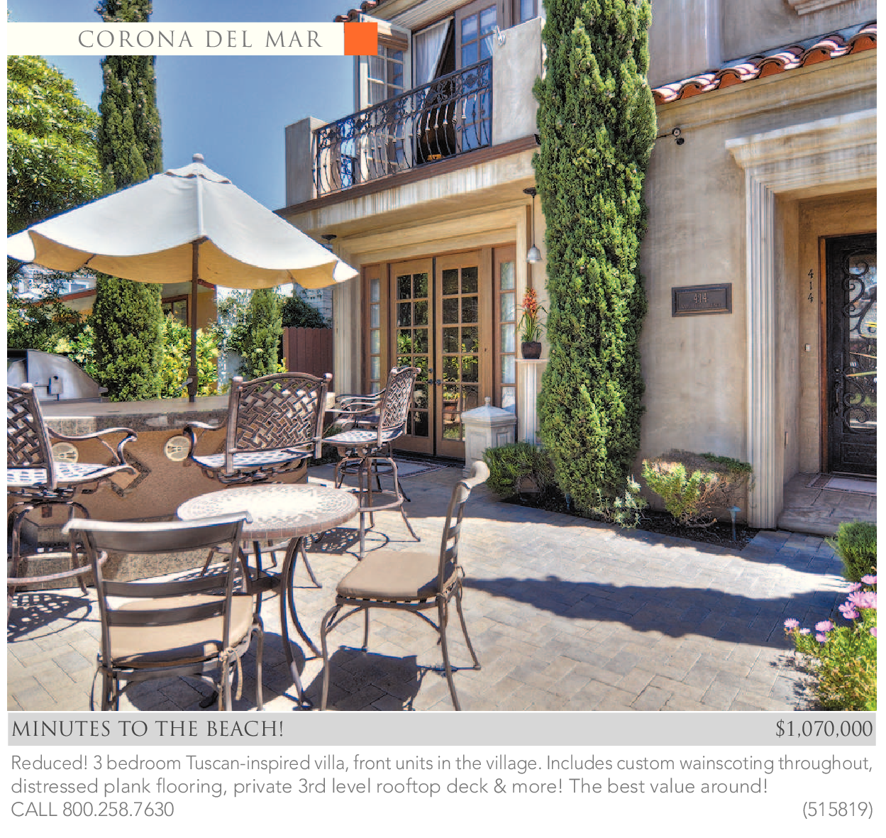CORONA DEL MAR MINUTES TO THE BEACH! $1,070,000 Reduced! 3 bedroom Tuscan-inspired villa, front units in the village. Includes custom wainscoting throughout, distressed plank fl ooring, private 3rd level rooftop deck & more! The best value around! CALL 800.258.7630 (515819) See also