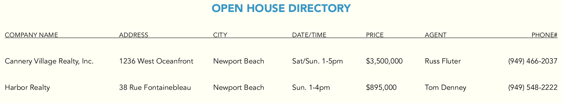 OPEN HOUSE DIRECTORY COMPANY NAME ADDRESS CITY DATE/TIME PRICE AGENT PHONE# Cannery Village Realty, Inc. 1236 West Oceanfront Newport Beach Sat/Sun. 1-5pm $3,500,000 Russ Fluter (949) 466-2037 Harbor Realty 38 Rue Fontainebleau Newport Beach Sun. 1-4pm $895,000 Tom Denney (949) 548-2222