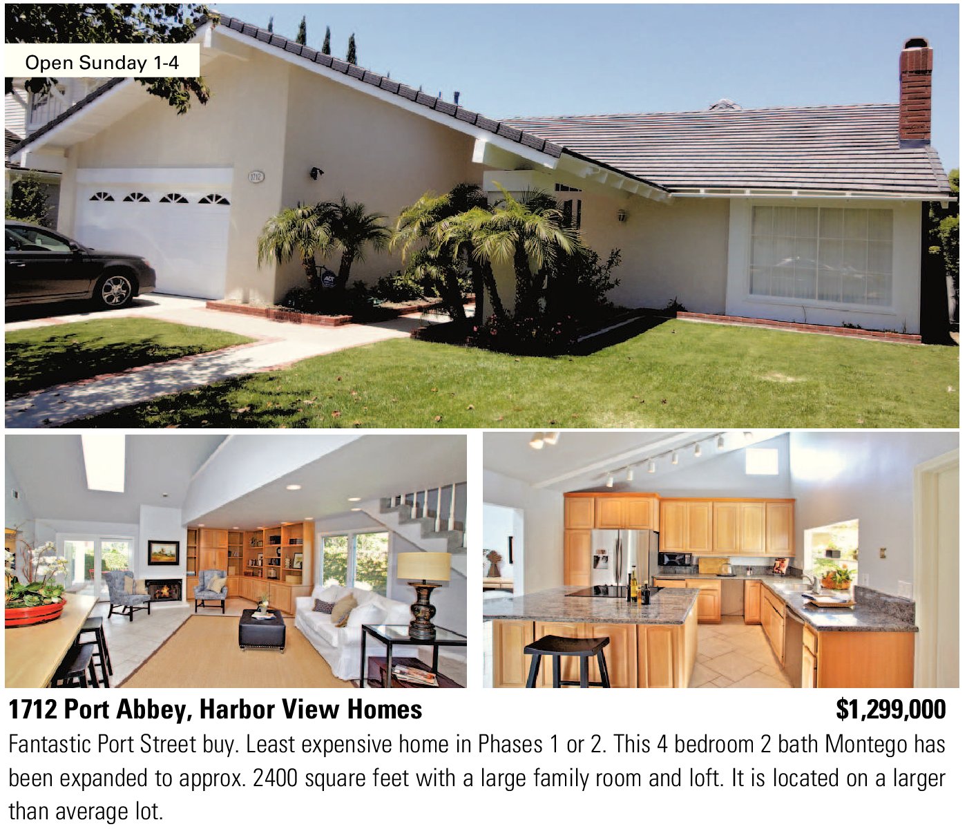 Open Sunday 1-4 1712 Port Abbey, Harbor View Homes $1,299,000 Fantastic Port Street buy. Least expensive home in Phases 1 or 2. This 4 bedroom 2 bath Montego has been expanded to approx. 2400 square feet with a large family room and loft. It is located on a larger than average lot. See also