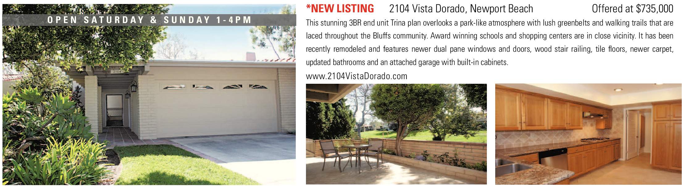 O P E N S A T U R D A Y & S U N D A Y 1 - 4 P M *NEW LISTING 2104 Vista Dorado, Newport Beach Offered at $735,000 This stunning 3BR end unit Trina plan overlooks a park-like atmosphere with lush greenbelts and walking trails that are laced throughout the Bluffs community. Award winning schools and shopping centers are in close vicinity. It has been recently remodeled and features newer dual pane windows and doors, wood stair railing, tile floors, newer carpet, updated bathrooms and an attached garage with built-in cabinets. www.2104VistaDorado.com See also