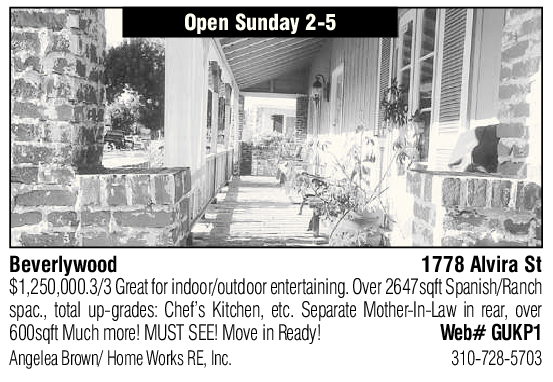 Open Sunday 2-5 Beverlywood 1778 Alvira St $1,250,000.3/3 Great for indoor/outdoor entertaining. Over 2647sqft Spanish/Ranch spac., total up-grades: Chef’s Kitchen, etc. Separate Mother-In-Law in rear, over 600sqft Much more! MUST SEE! Move in Ready! Web# GUKP1 Angelea Brown/ Home Works RE, Inc. 310-728-5703