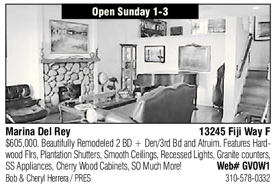 Open Sunday 1-3 Marina Del Rey 13245 Fiji Way F $605,000. Beautifully Remodeled 2 BD + Den/3rd Bd and Atruim. Features Hardwood Flrs, Plantation Shutters, Smooth Ceilings, Recessed Lights, Granite counters, SS Appliances, Cherry Wood Cabinets, SO Much More! Web# GVOW1 Bob & Cheryl Herrera / PRES 310-578-0332