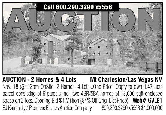 Call 800.290.3290 x5558 AUCTION - 2 Homes & 4 Lots Mt Charleston/Las Vegas NV Nov. 18 @ 12pm OnSite. 2 Homes, 4 Lots...One Price! Oppty to own 1.47-acre parcel consisting of 6 parcels incl. two 4BR/5BA homes of 13,000 sqft enclosed space on 2 lots. Opening Bid $1 Million (84% Off Orig. List Price) Web# GVLE1 Ed Kaminsky / Premiere Estates Auction Company 800.290.3290 x5558 $1,000,000