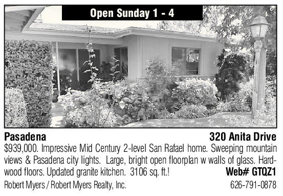 Open Sunday 1 - 4 Pasadena 320 Anita Drive $939,000. Impressive Mid Century 2-level San Rafael home. Sweeping mountain views & Pasadena city lights. Large, bright open loorplan w walls of glass. Hardwood loors. Updated granite kitchen. 3106 sq. ft.! Web# GTQZ1 Robert Myers / Robert Myers Realty, Inc. 626-791-0878 See also