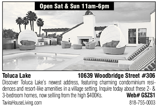 Toluca Lake 10639 Woodbridge Street #306 Discover Toluca Lake’s newest address, featuring charming condominium residences and resort-like amenities in a village setting. Inquire today about these 2- & 3-bedroom homes, now selling from the high $400Ks. Web# GSZS1 TaviraHouseLiving.com 818-755-0003