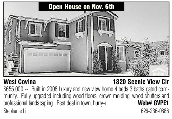 Open House on Nov. 6th West Covina 1820 Scenic View Cir $655,000 -- Built in 2008 Luxury and new view home 4 beds 3 baths gated com- munity. Fully upgraded including wood loors, crown molding, wood shutters and professional landscaping. Best deal in town, hurry-u Web# GVPE1 Stephanie Li 626-236-0886