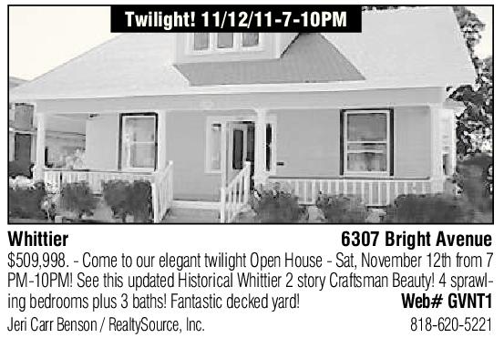 Twilight! 11/12/11-7-10PM Whittier 6307 Bright Avenue $509,998. - Come to our elegant twilight Open House - Sat, November 12th from 7 PM-10PM! See this updated Historical Whittier 2 story Craftsman Beauty! 4 sprawl- ing bedrooms plus 3 baths! Fantastic decked yard! Web# GVNT1 Jeri Carr Benson / RealtySource, Inc. 818-620-5221
