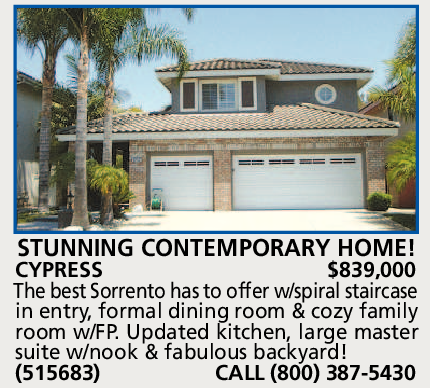 STUNNING CONTEMPORARY HOME! CYPRESS $839,000 The best Sorrento has to offer w/spiral staircase in entry, formal dining room & cozy family room w/FP. Updated kitchen, large master suite w/nook & fabulous backyard! (515683) CALL (800) 387-5430