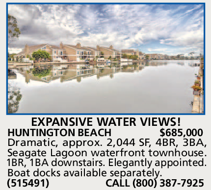 HUNTINGTON BEACH $685,000 Dramatic, approx. 2,044 SF, 4BR, 3BA, Seagate Lagoon waterfront townhouse.