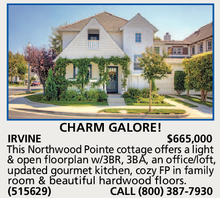 IRVINE $665,000 This Northwood Pointe cottage offers a light & open floorplan w/3BR, 3BA, an office/loft, updated gourmet kitchen, cozy FP in family room & beautiful hardwood floors. (515629) CALL (800) 387-7930
