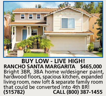 RANCHO SANTA MARGARITA $465,000 Bright 3BR, 3BA home w/designer paint, hardwood floors, spacious kitchen, expanded living room, new loft & separate family room that could be converted into 4th BR! (515782) CALL (800) 387-1455