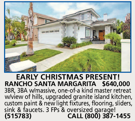 RANCHO SANTA MARGARITA $640,000 3BR, 3BA w/massive, one-of-a kind master retreat w/view of hills, upgraded granite island kitchen, custom paint & new light fixtures, flooring, sliders, sink & faucets. 3 FPs & oversized garage! (515783) CALL (800) 387-1455