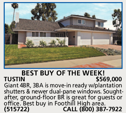 TUSTIN $569,000 Giant 4BR, 3BA is move-in ready w/plantation shutters & newer dual-pane windows. Soughtafter, ground-floor BR is great for guests or office. Best buy in Foothill High area. (515722) CALL (800) 387-7922