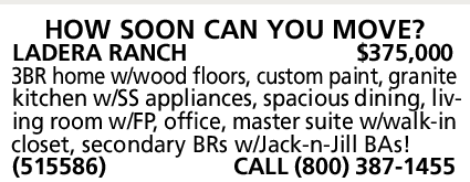LADERA RANCH $375,000 3BR home w/wood floors, custom paint, granite kitchen w/SS appliances, spacious dining, living room w/FP, office, master suite w/walk-in closet, secondary BRs w/Jack-n-Jill BAs! (515586) CALL (800) 387-1455