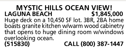 LAGUNA BEACH $1,845,000 Huge deck on a 10,450 SF lot. 3BR, 2BA home boasts granite kitchen w/warm wood cabinetry that opens to huge dining room w/windows overlooking ocean.