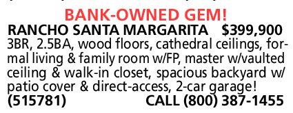 RANCHO SANTA MARGARITA $399,900 3BR, 2.5BA, wood floors, cathedral ceilings, formal living & family room w/FP, master w/vaulted ceiling & walk-in closet, spacious backyard w/ patio cover & direct-access, 2-car garage! (515781) CALL (800) 387-1455