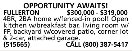 FULLERTON $300,000 - $319,000 4BR, 2BA home w/fenced-in pool! Open kitchen w/breakfast bar, living room w/ FP, backyard w/covered patio, corner lot & 2-car, attached garage.