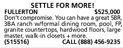 FULLERTON $525,000 Don’t compromise. You can have a great 5BR, 3BA ranch w/formal dining room, pool, FP, granite countertops, hardwood floors, large master, walk-in closets + more. (515516) CALL (888) 456-9235