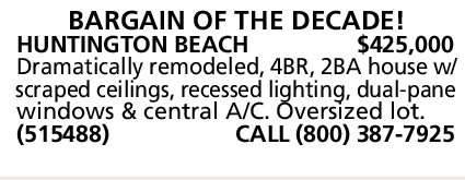 HUNTINGTON BEACH $425,000 Dramatically remodeled, 4BR, 2BA house w/ scraped ceilings, recessed lighting, dual-pane windows & central A/C. Oversized lot. (515488) CALL (800) 387-7925