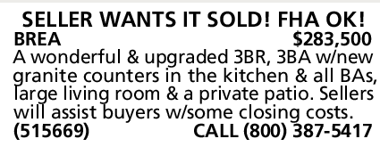 BREA $283,500 A wonderful & upgraded 3BR, 3BA w/new granite counters in the kitchen & all BAs, large living room & a private patio. Sellers will assist buyers w/some closing costs. (515669) CALL (800) 387-5417